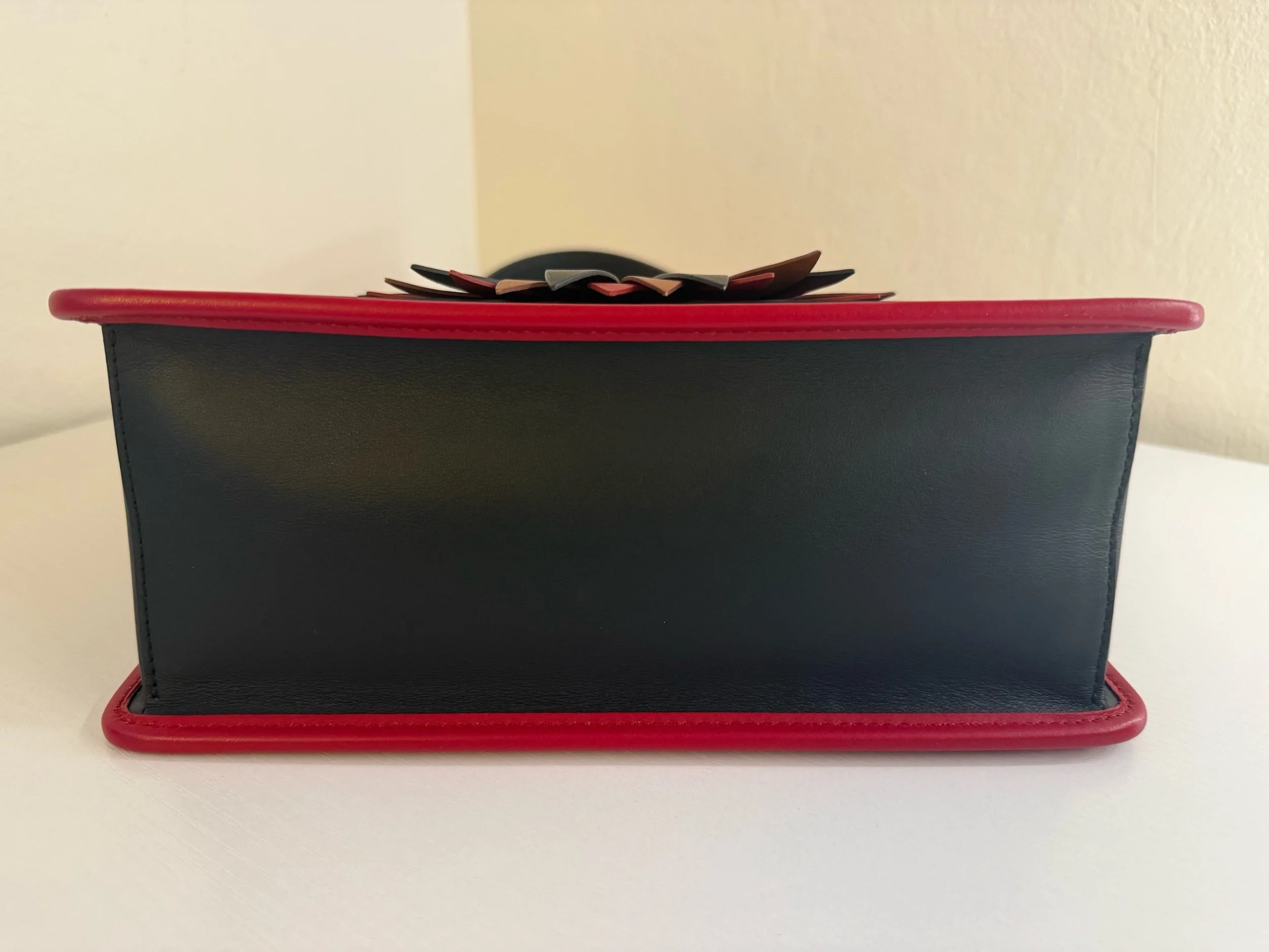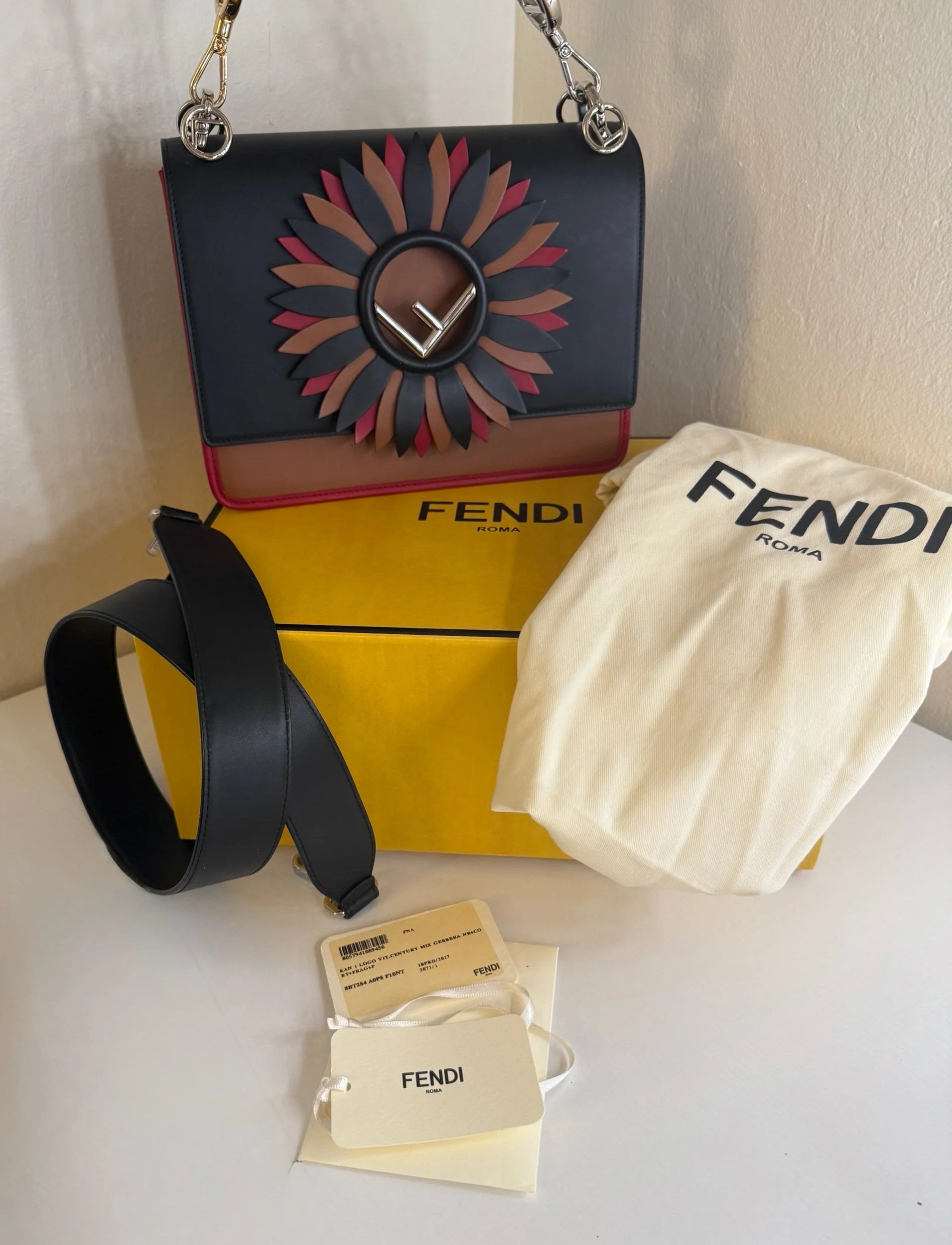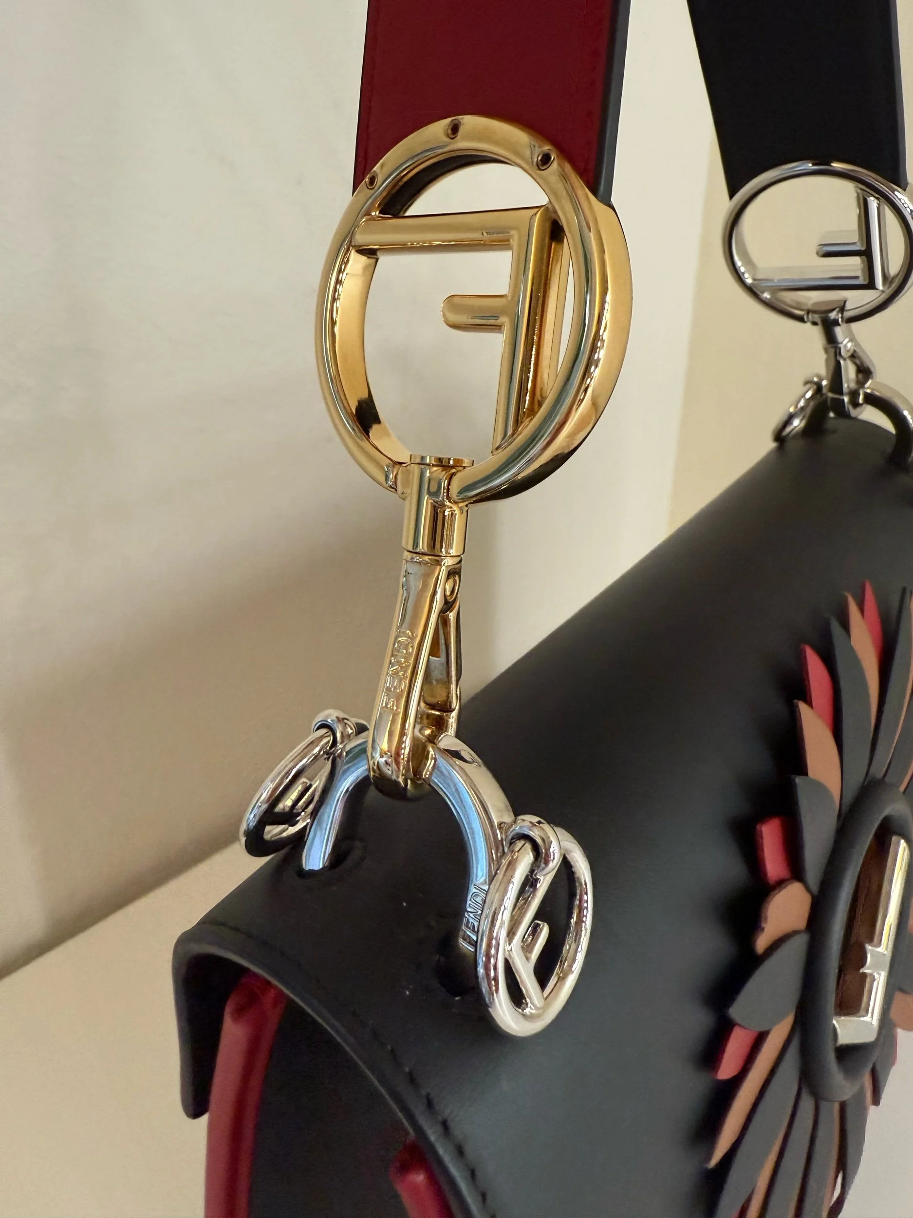 Elevate your accessory game with the Fendi Calfskin Leather Kan I F "Flower Burst" Shoulder Bag—a piece that perfectly balances whimsical charm with high-end sophistication. Crafted from buttery-soft calfskin, this bag stands out with its intricate "Flower Burst" motif—leather petals delicately framing the iconic "F" logo hardware. It includes two detachable leather shoulder straps, allowing you to customize your look from a classic shoulder bag to a modern crossbody.