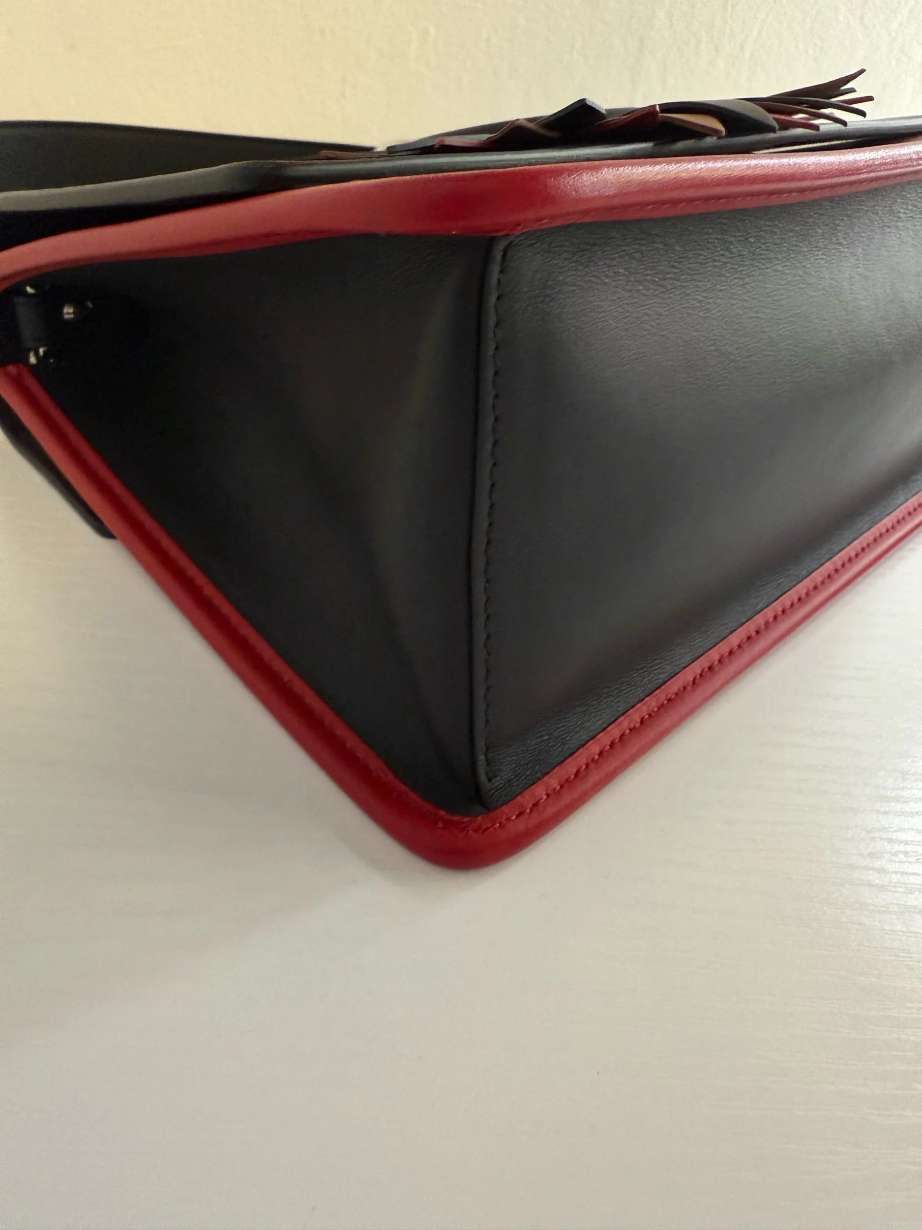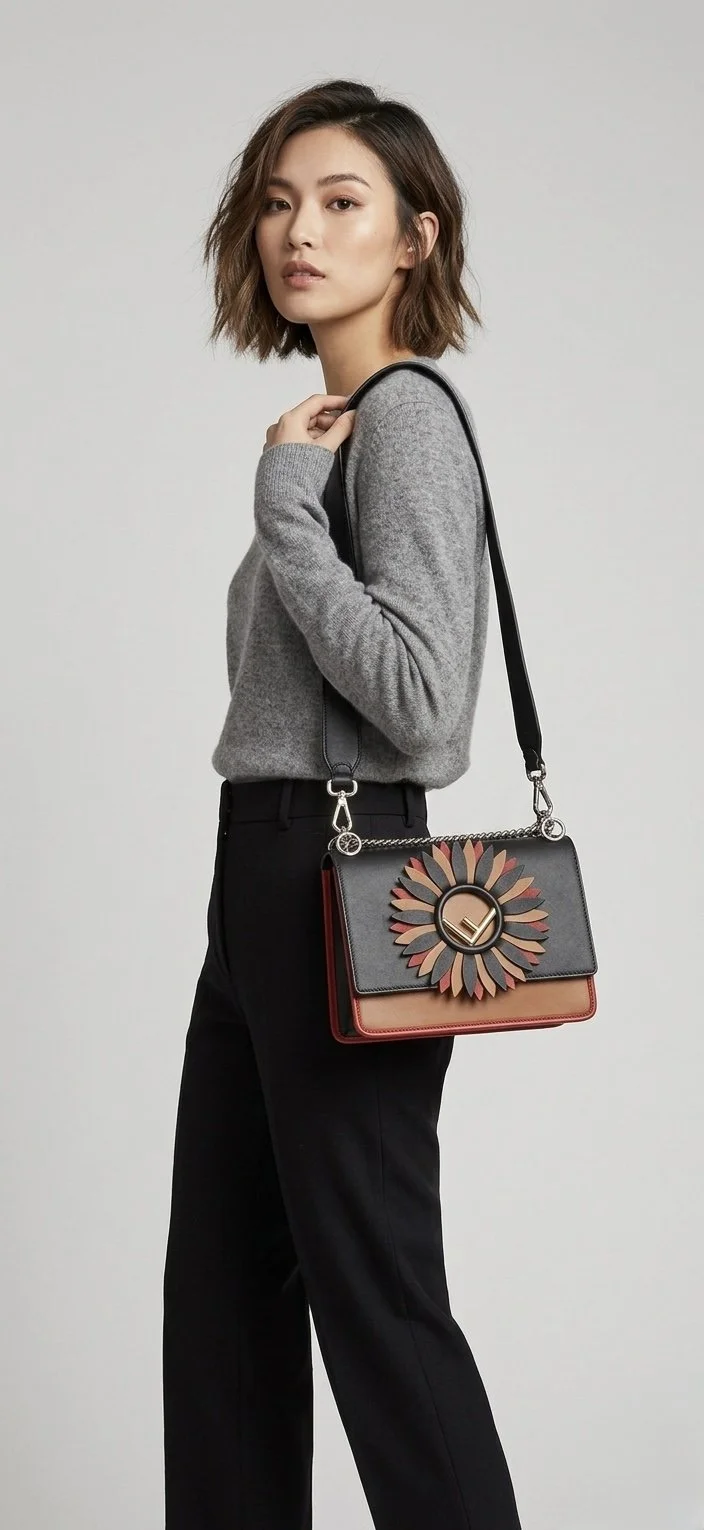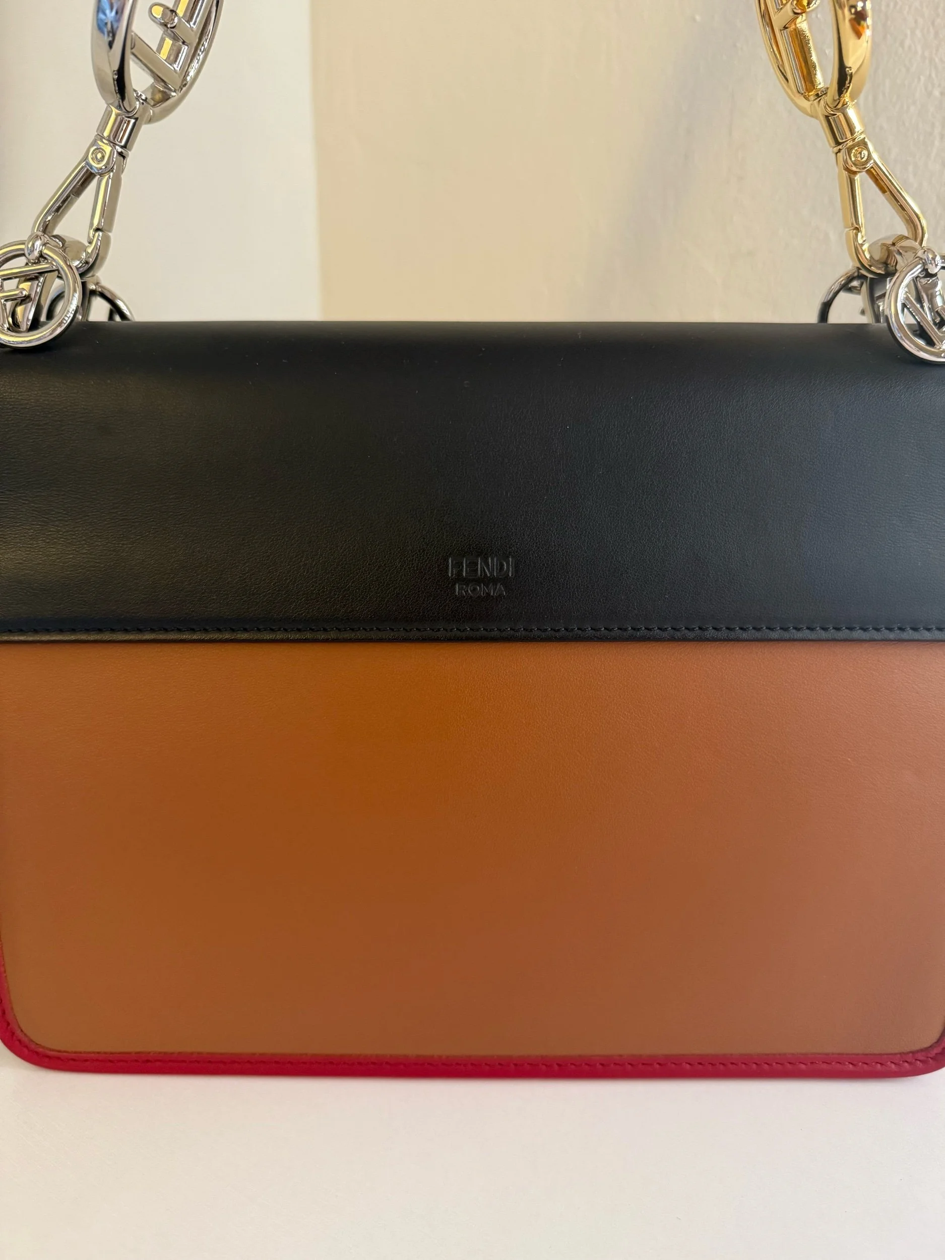 Elevate your accessory game with the Fendi Calfskin Leather Kan I F "Flower Burst" Shoulder Bag—a piece that perfectly balances whimsical charm with high-end sophistication. Crafted from buttery-soft calfskin, this bag stands out with its intricate "Flower Burst" motif—leather petals delicately framing the iconic "F" logo hardware. It includes two detachable leather shoulder straps, allowing you to customize your look from a classic shoulder bag to a modern crossbody.