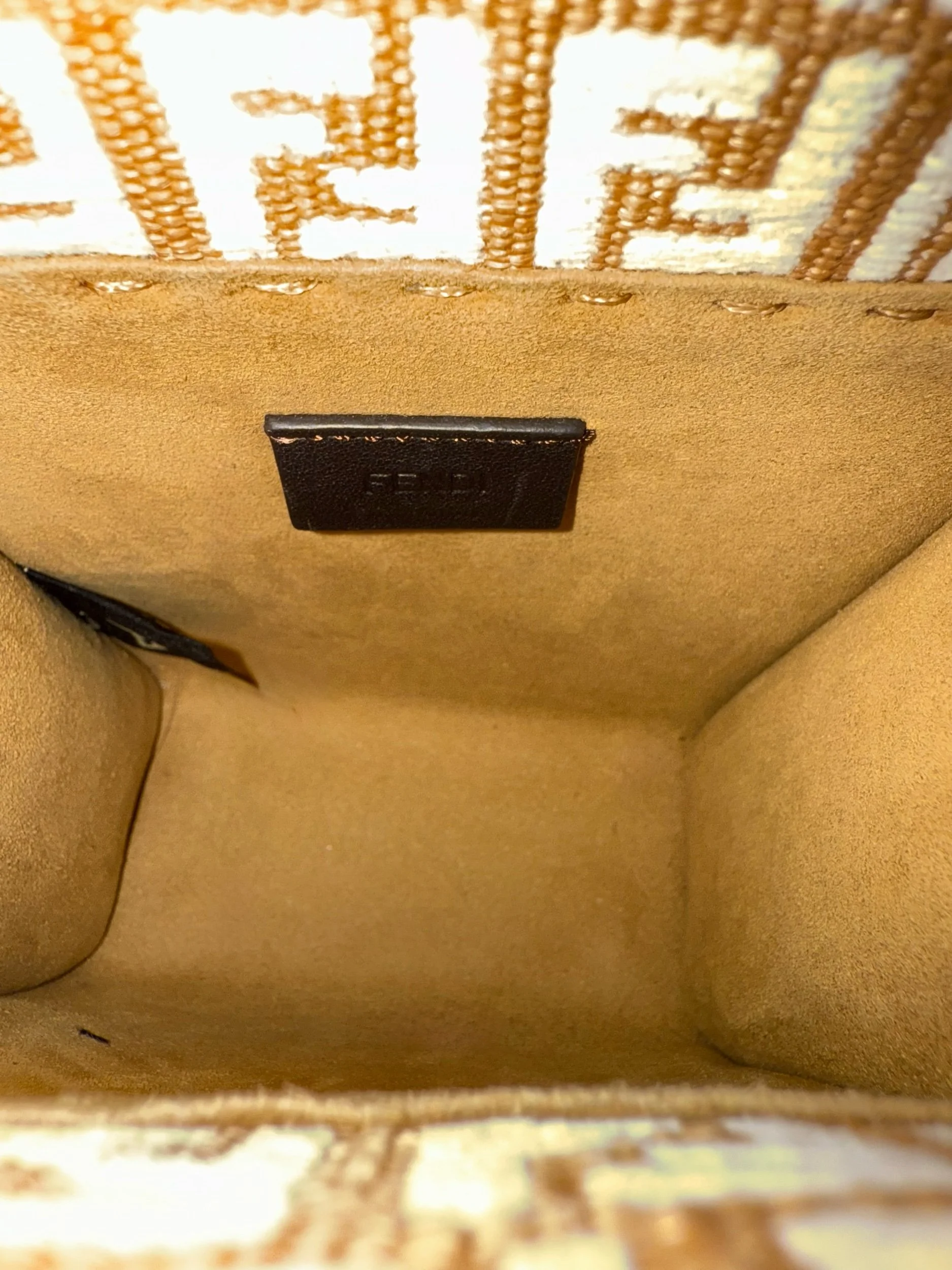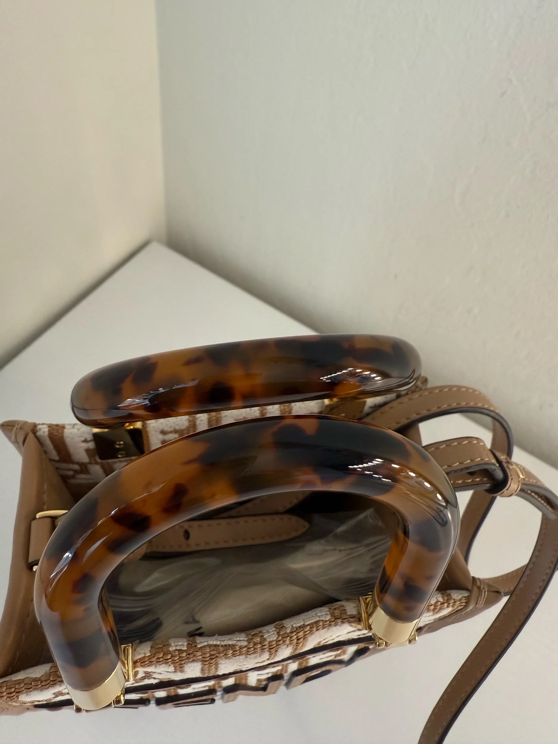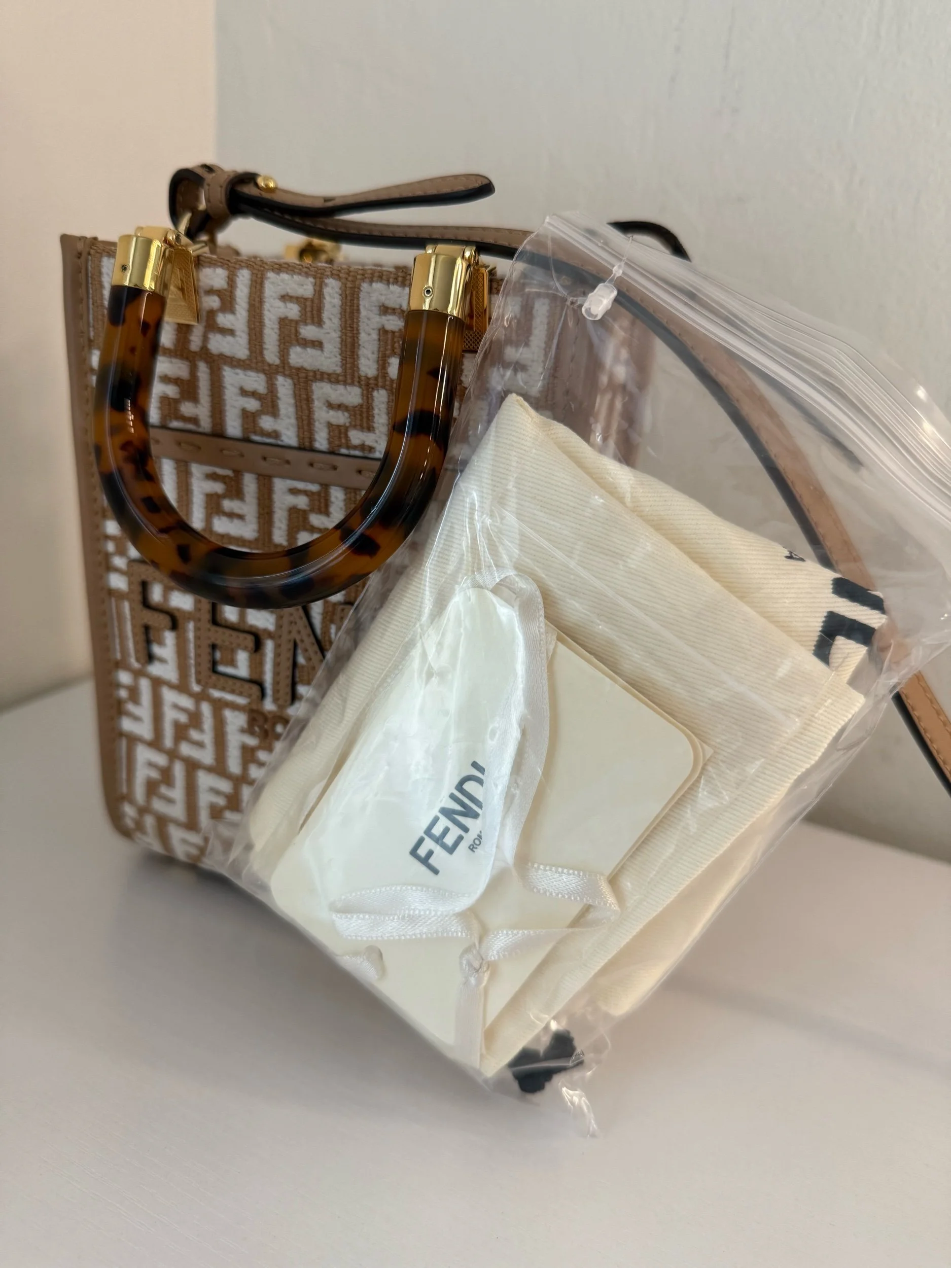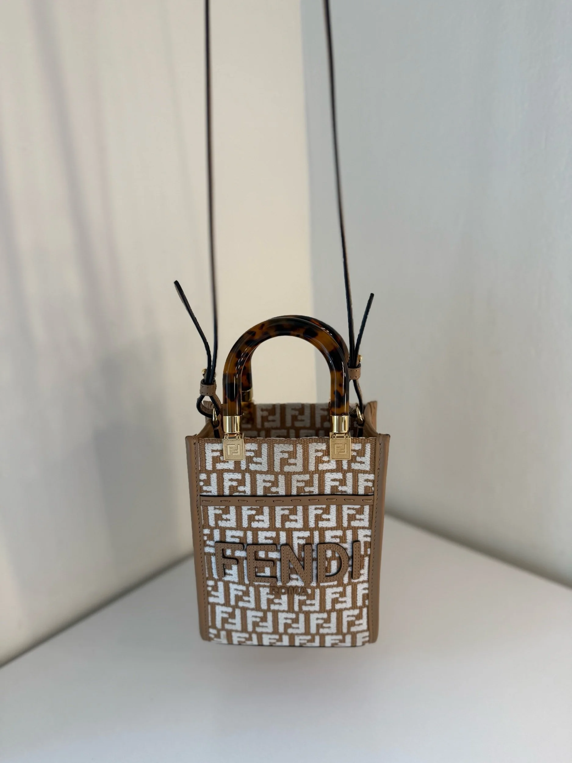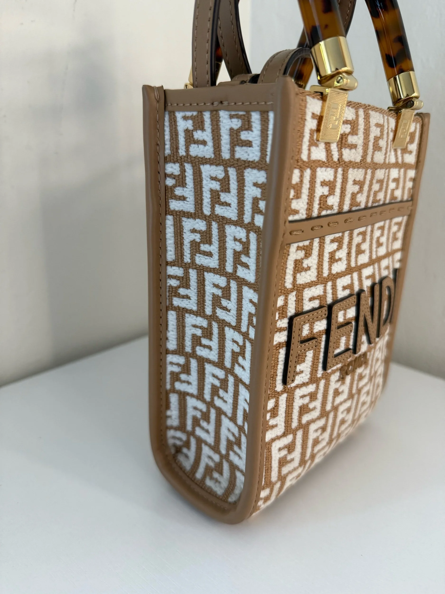 Elevate your style with the Fendi Sunshine Mini Shopper Tote. Crafted from beige and white monogram canvas and Zucca embroidered raffia with leather trim, this chic bag features signature tortoiseshell-effect plexiglass handles and gleaming gold-tone hardware. Designed for versatility, it includes a lined interior and a detachable, adjustable strap for seamless transitions from hand-carry to crossbody wear.