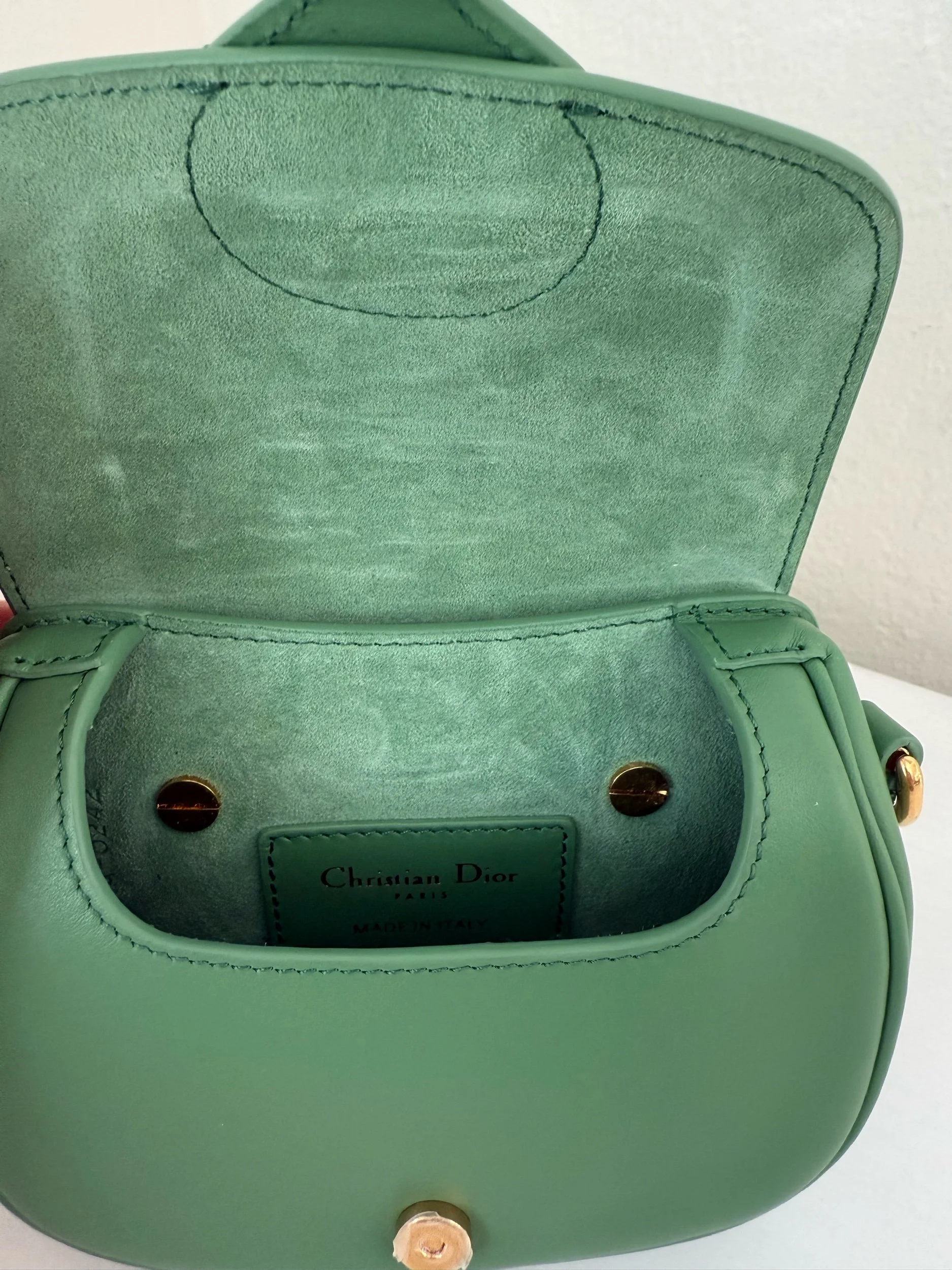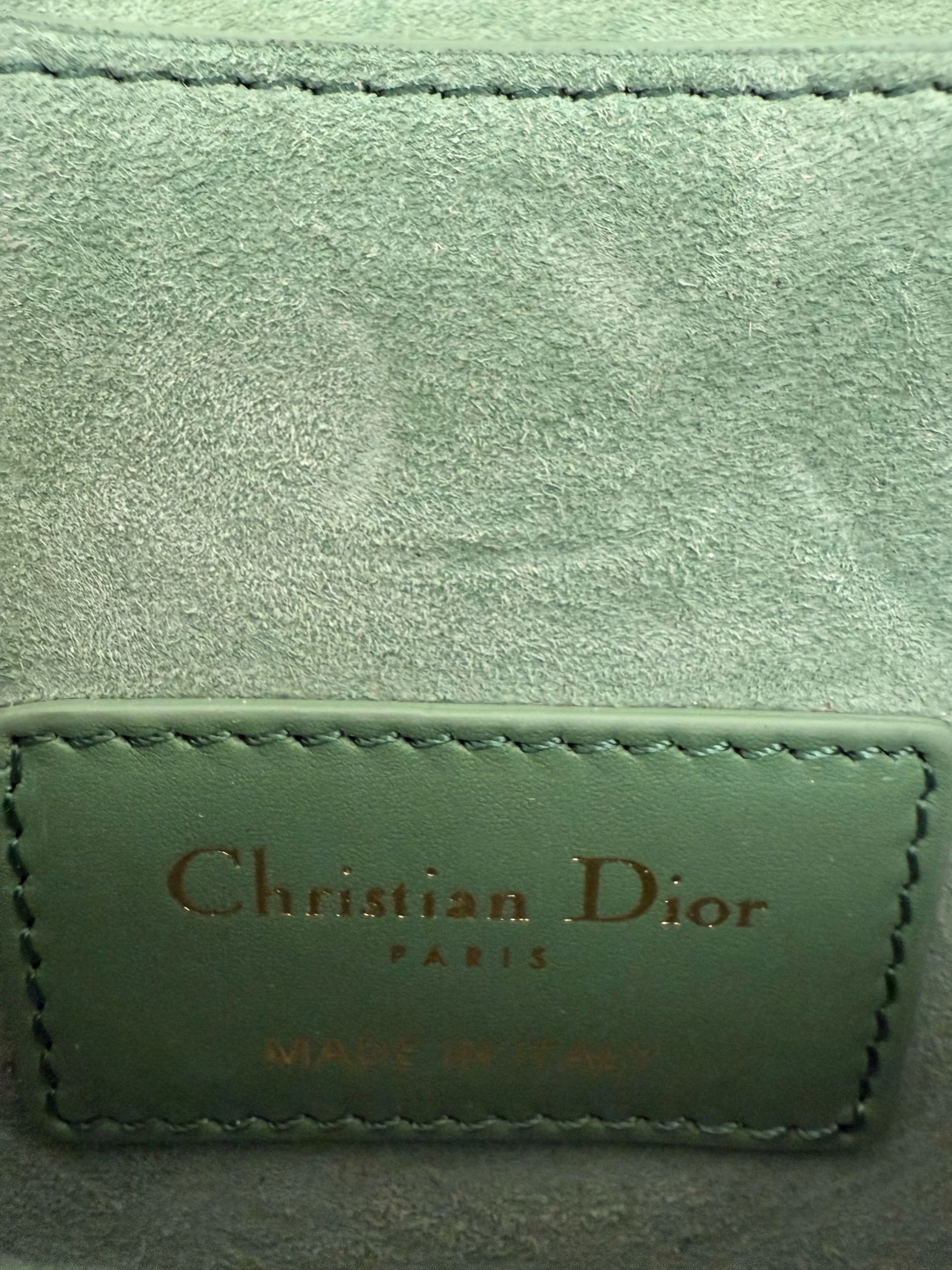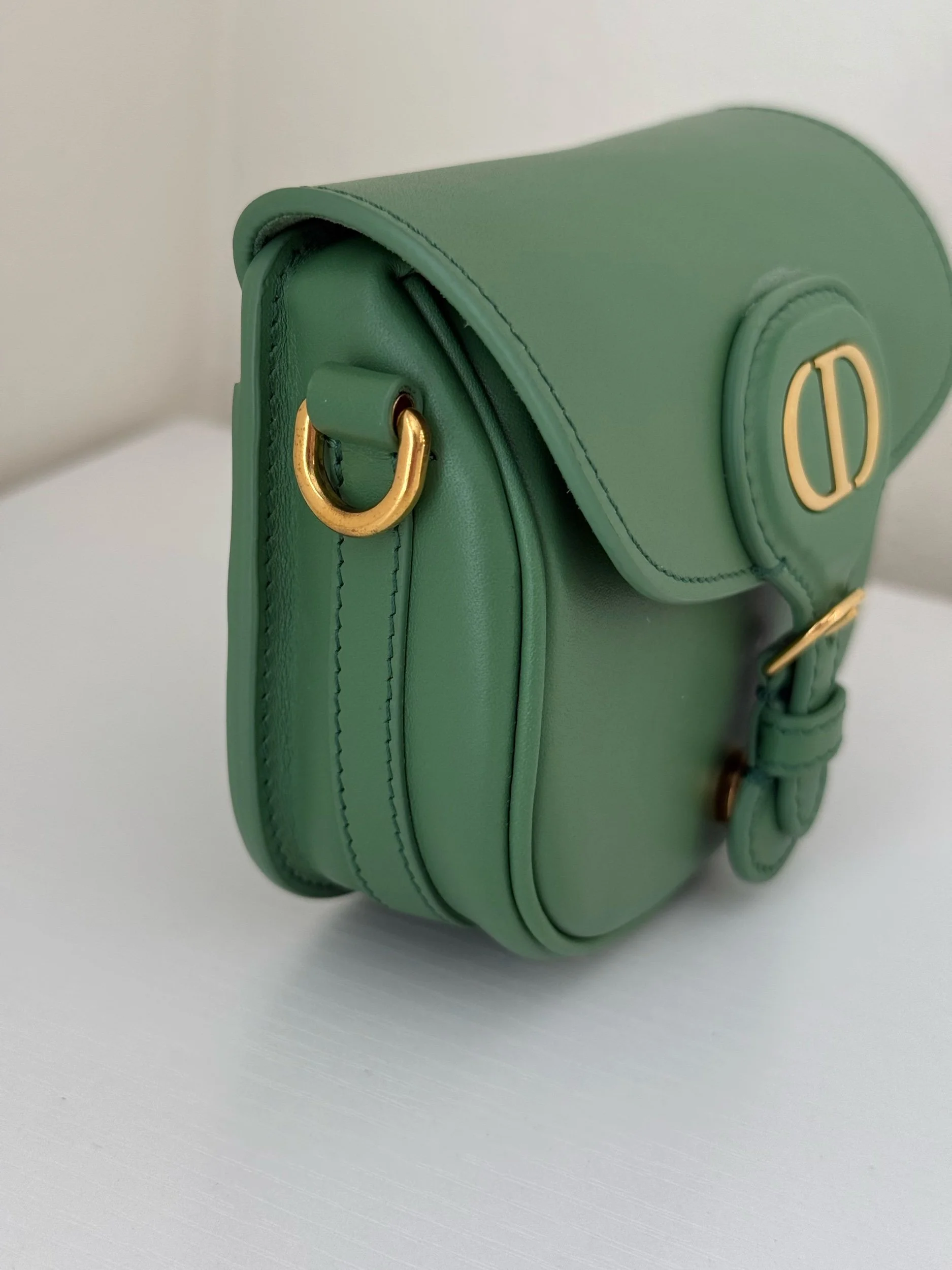 The Micro Bobby Bag from Christian Dior is an exquisite piece of craftsmanship rendered in a sophisticated Sage Green. It’s sculpted from smooth box calfskin leather, offering a sleek and structured silhouette, and detailed with brilliant gold-finish hardware. Includes an adjustable leather shoulder strap for versatile wear and the front flap secures with a magnetic clasp, opening to reveal a coordinated suede-lined interior. Retails for $3800.