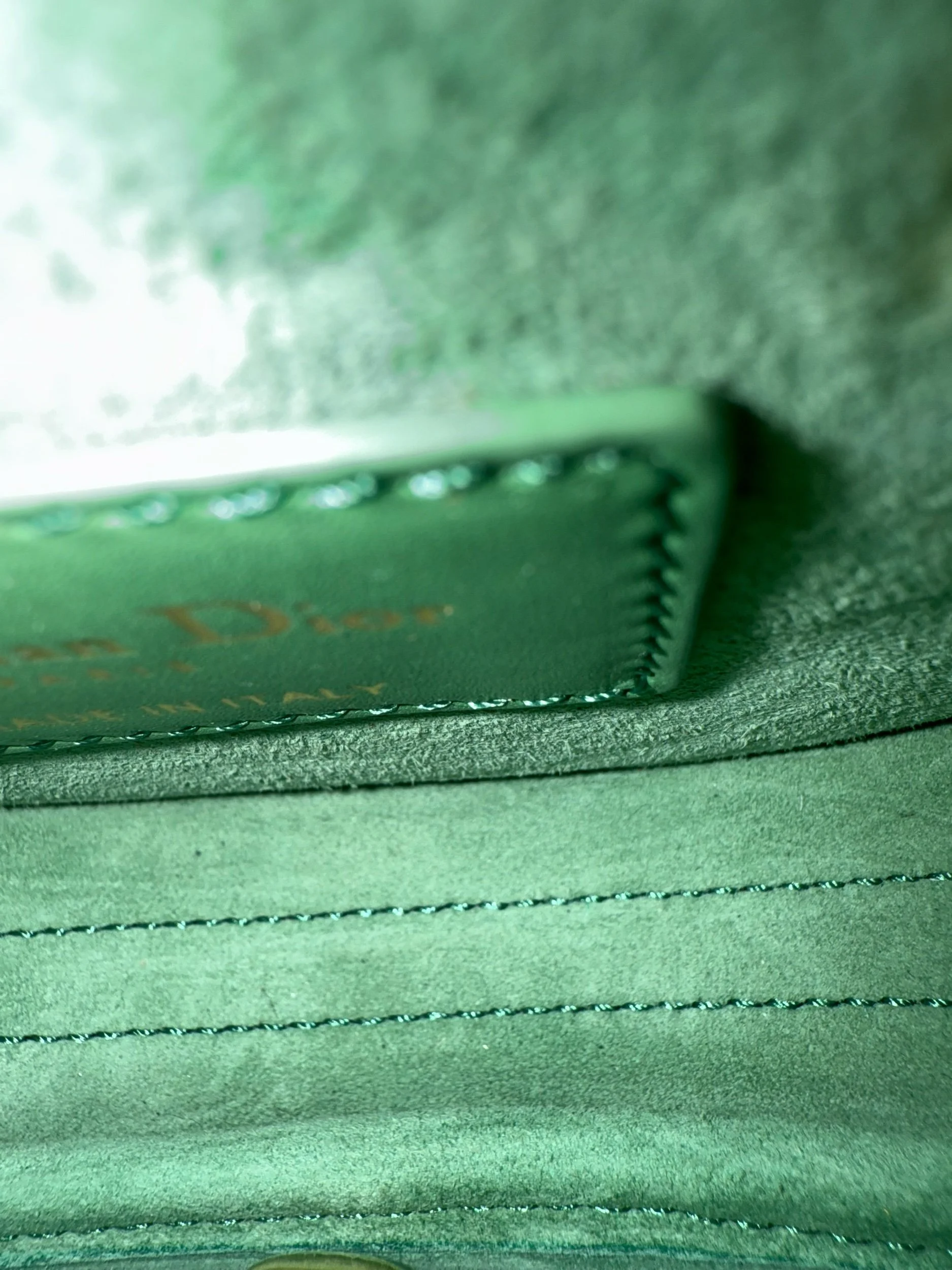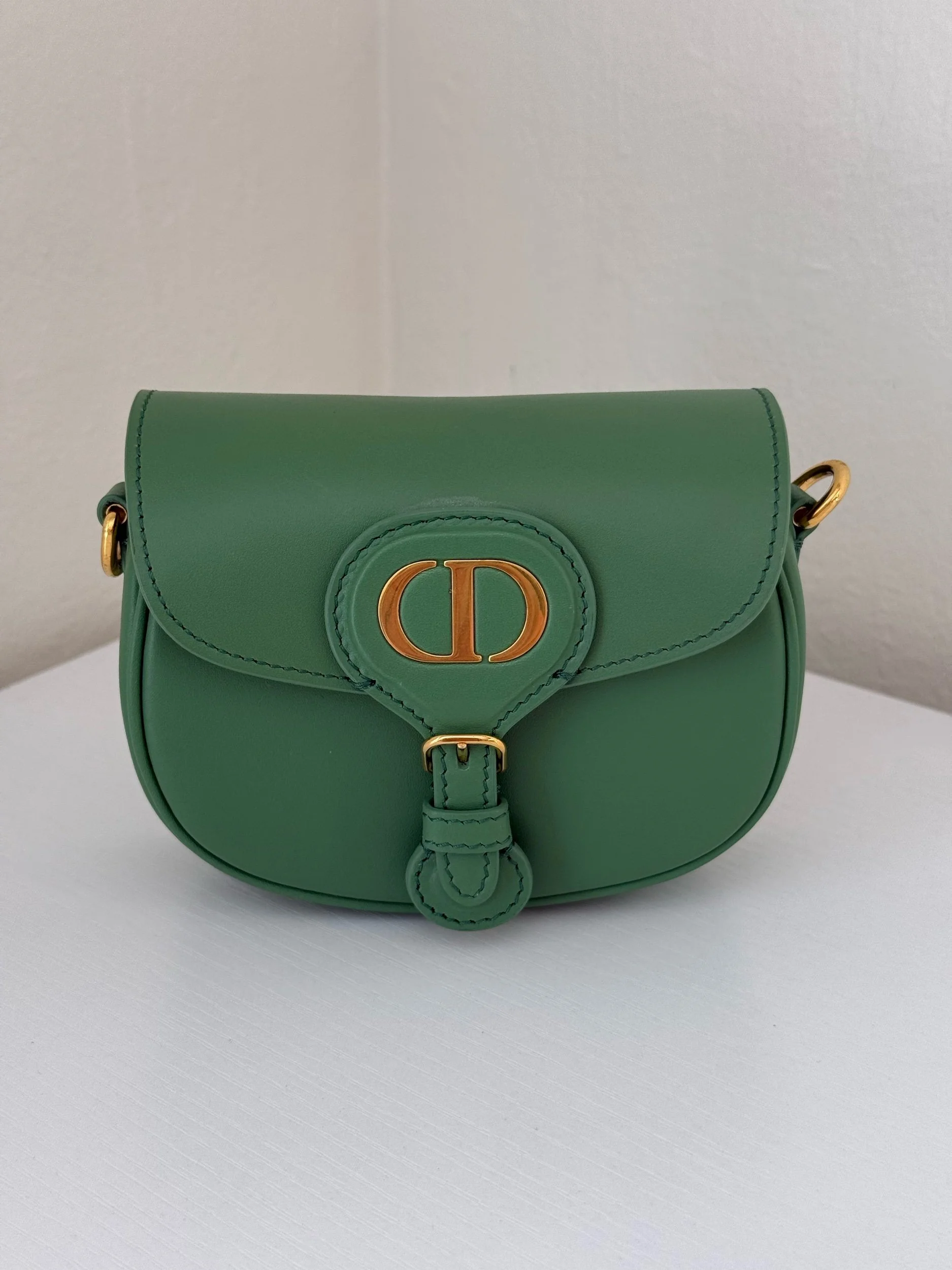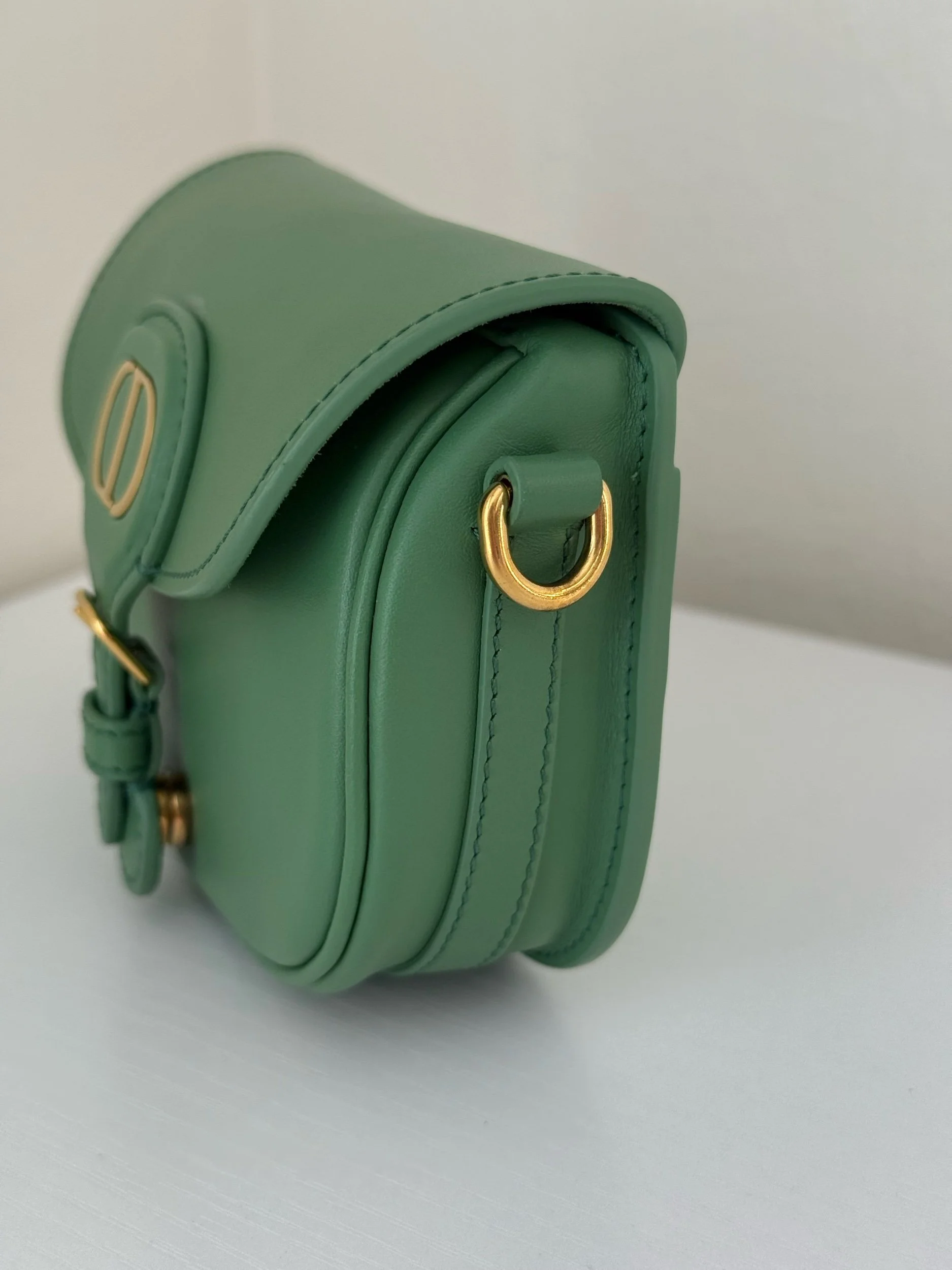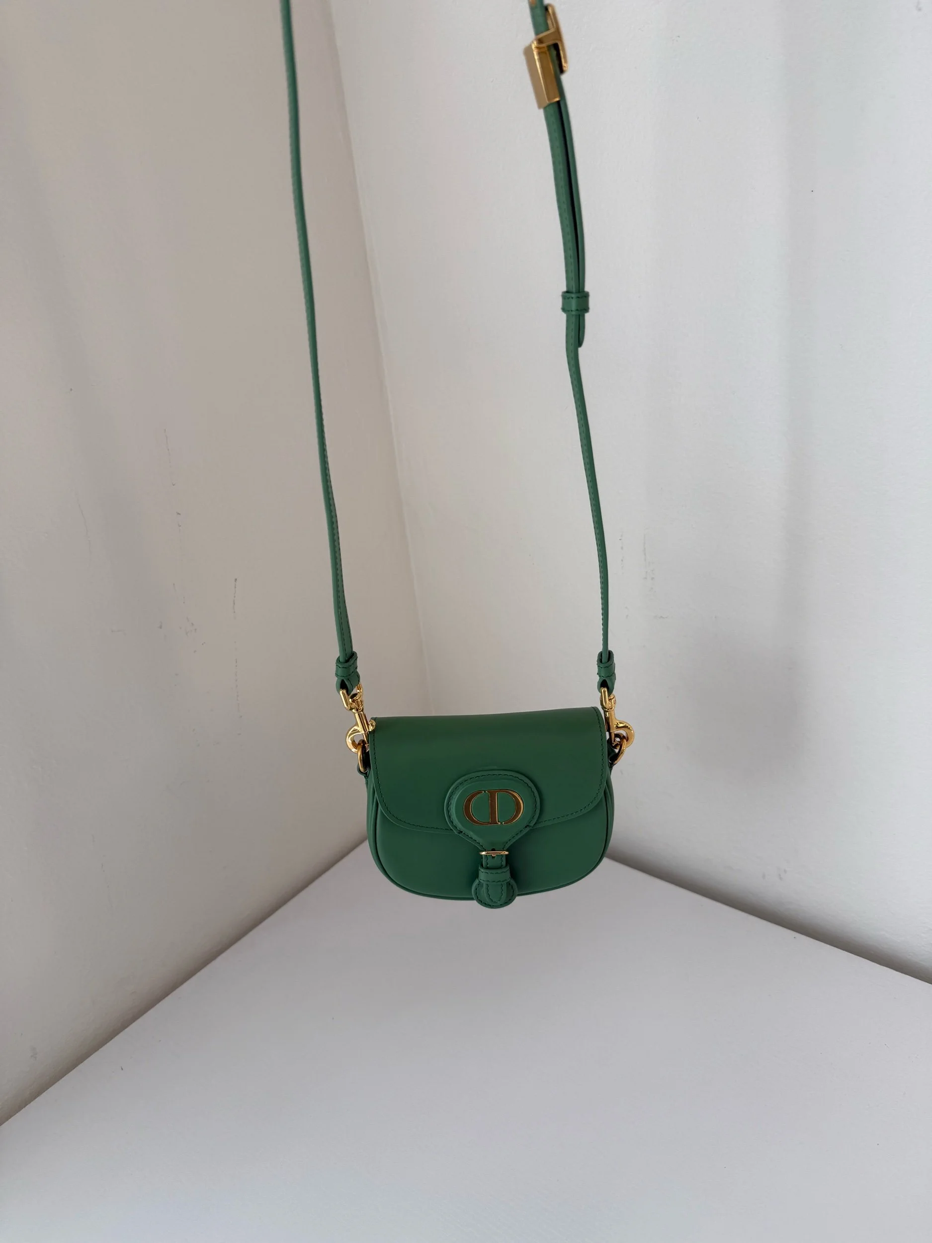 The Micro Bobby Bag from Christian Dior is an exquisite piece of craftsmanship rendered in a sophisticated Sage Green. It’s sculpted from smooth box calfskin leather, offering a sleek and structured silhouette, and detailed with brilliant gold-finish hardware. Includes an adjustable leather shoulder strap for versatile wear and the front flap secures with a magnetic clasp, opening to reveal a coordinated suede-lined interior. Retails for $3800.