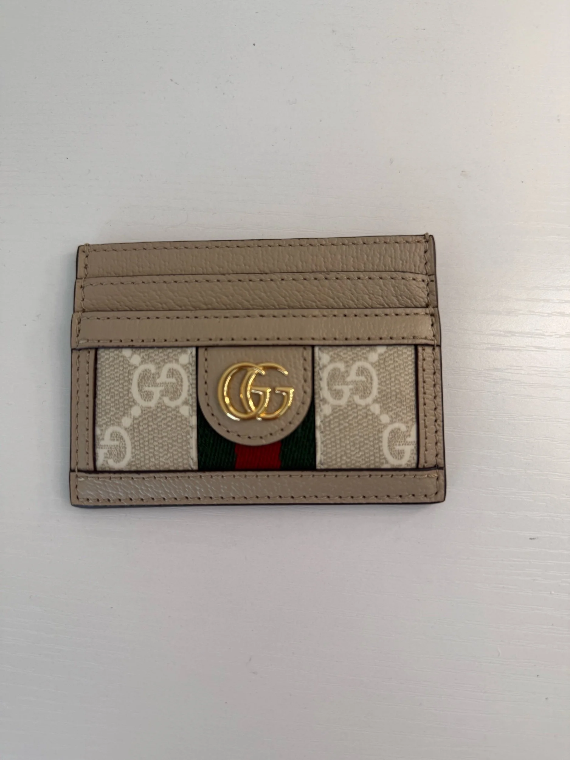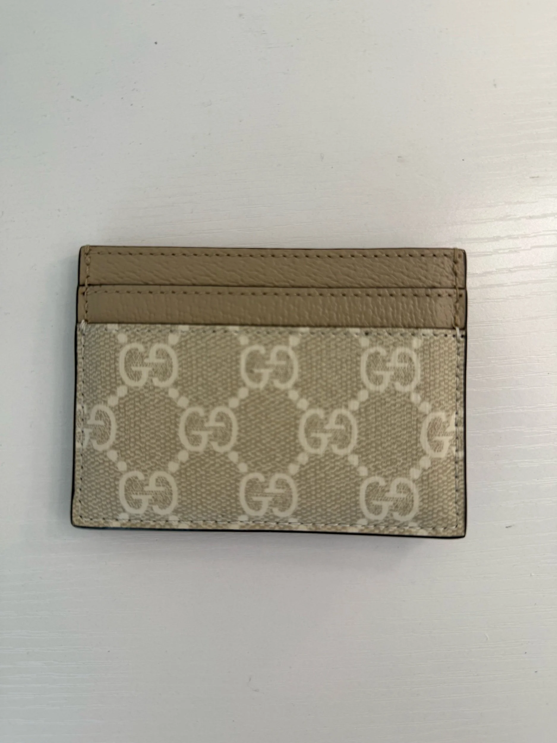 This is a chic, multi-tonal GUCCI GG Supreme Card Case crafted in a sophisticated palette of Beige, Mystic White, and Oatmeal. Combining the brand's iconic coated canvas with smooth "Dollar" calfskin leather, the wallet is punctuated by the signature gold-tone GG Marmont hardware. The secure snap closure reveals a well-organized leather interior featuring a dedicated bill compartment, card slots, and a zippered pocket for coins.