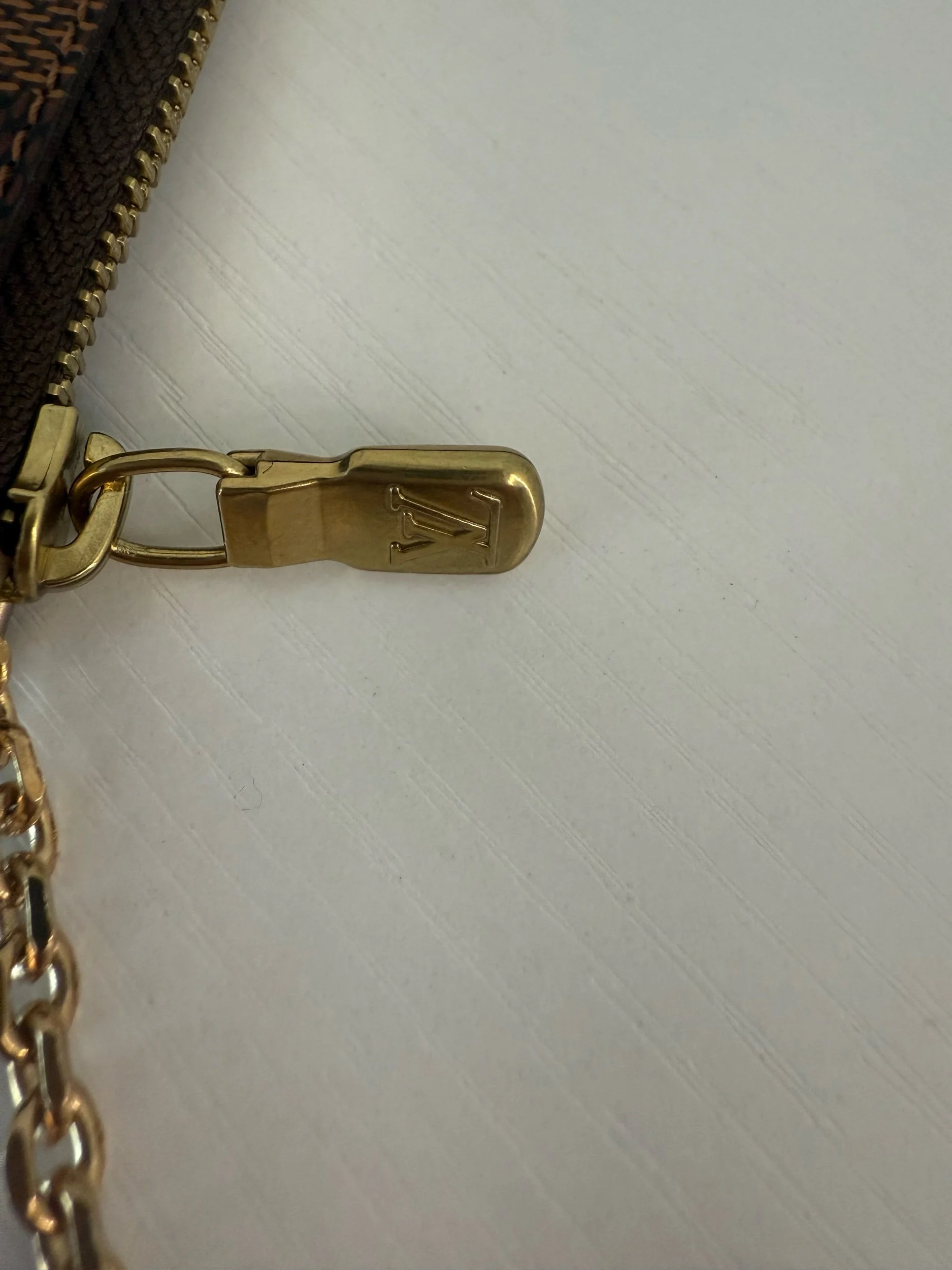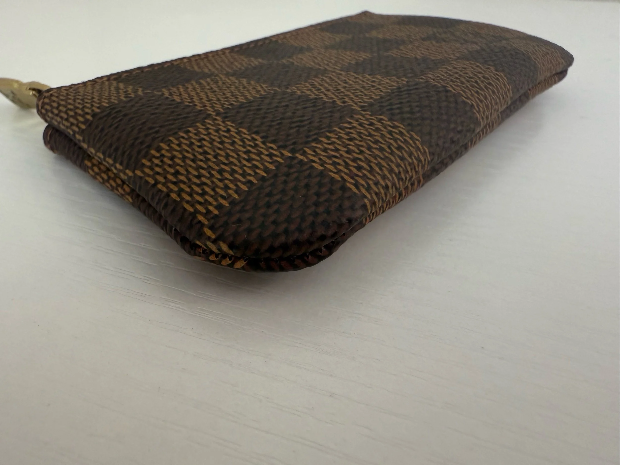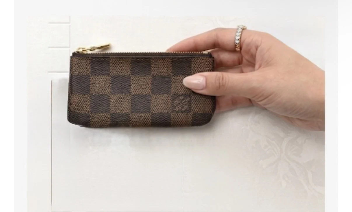 This genuine Louis Vuitton Damier Ebene Key Pouch is a timeless essential. Meticulously crafted from the brand’s signature brown checkered coated canvas, it features a secure top-zip closure. The interior is lined with durable brown crossgrain leather and includes a versatile brass D-ring clasp for effortless attachment to keys or your favorite handbag.
